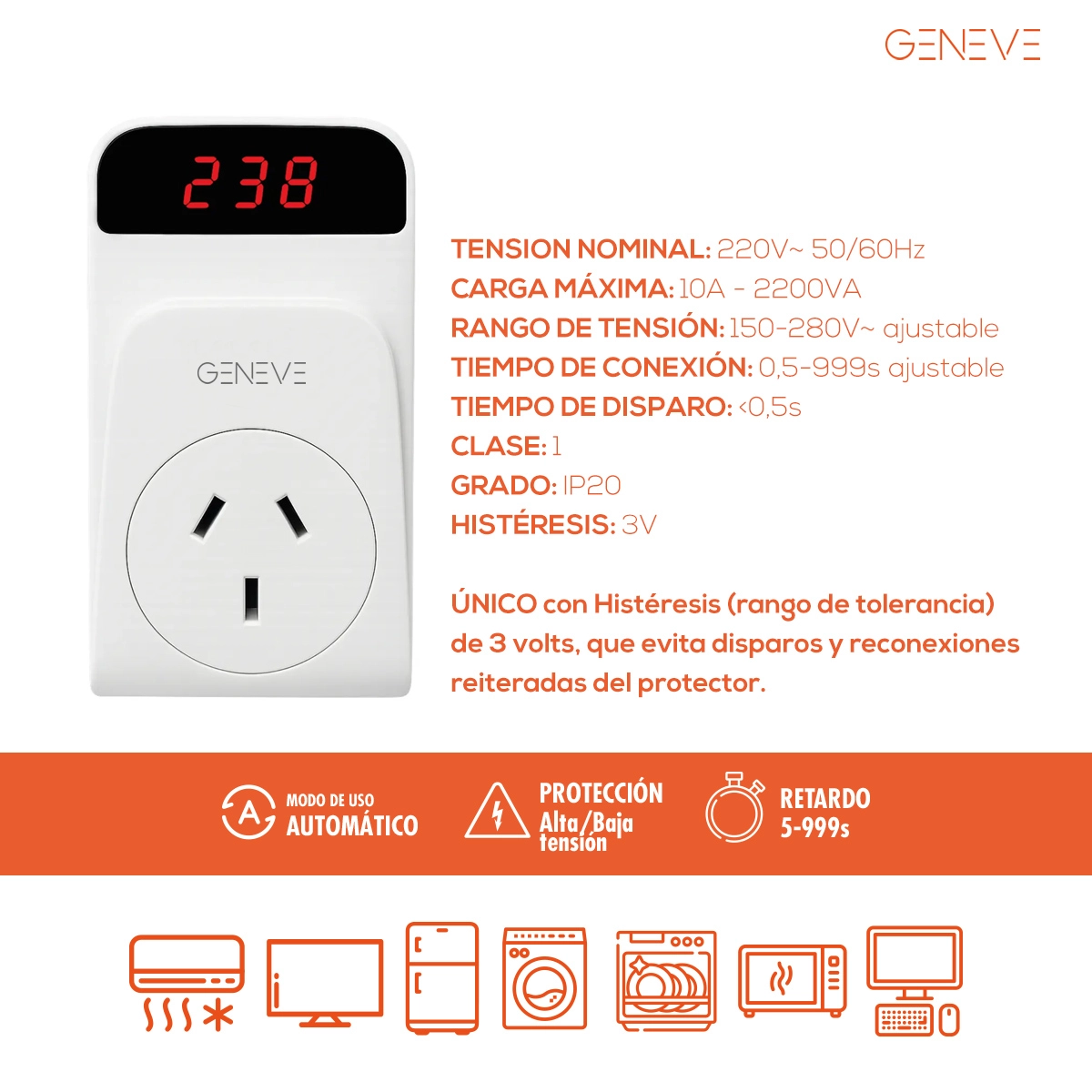 Un equipo diseñado para proteger tus aparatos eléctricos contra las variaciones peligrosas de tensión, desconectándolos automáticamente cuando el voltaje detectado está fuera de rangos seguros y reconectándolos cuando vuelve a la normalidad.